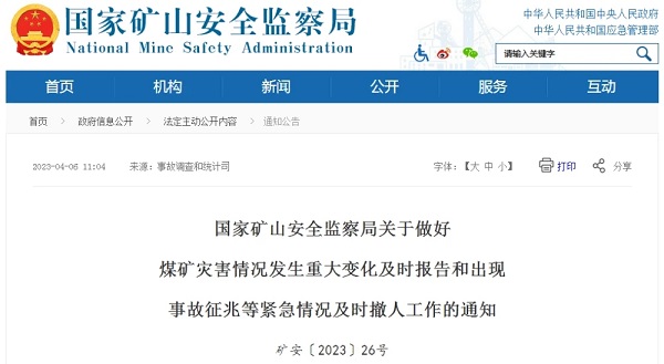 2、4月6日,國(guó)家礦山安全監(jiān)察局發(fā)布的《關(guān)于做好煤礦災(zāi)害情況發(fā)生重大變化及時(shí)報(bào)告和出現(xiàn)事故征兆等緊急情況及時(shí)撤人工作的通知》指出,建立煤礦災(zāi)害情況發(fā)生重大變化及時(shí)報(bào)告制度和建立煤礦出現(xiàn)事故征兆等緊急情況及時(shí)撤人制度。