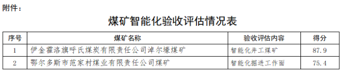 根據(jù)《內(nèi)蒙古自治區(qū)煤礦智能化建設(shè)驗(yàn)收辦法(試行)》《內(nèi)蒙古自治區(qū)煤礦智能化建設(shè)基本要求及評(píng)分方法(試行)》,鄂爾多斯市能源局會(huì)同國(guó)家礦山安監(jiān)局內(nèi)蒙古局監(jiān)察執(zhí)法處組織對(duì)伊金霍洛旗呼氏煤炭有限責(zé)任公司淖爾壕煤礦等2處煤礦進(jìn)行驗(yàn)收評(píng)估(驗(yàn)收評(píng)估情況見附件),得分達(dá)到驗(yàn)收評(píng)估標(biāo)準(zhǔn),現(xiàn)予以公示,接受社會(huì)監(jiān)督。公示期間,如發(fā)現(xiàn)申報(bào)煤礦存在弄虛作假等違法違規(guī)行為的,將依規(guī)定取消其申報(bào)資 格。