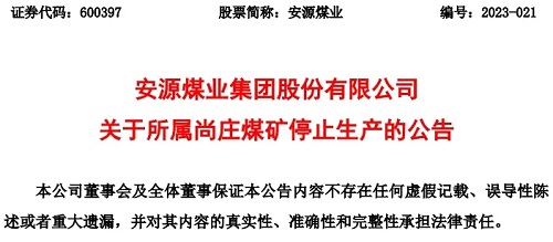 8、 安源煤業(yè)發(fā)布公告稱,2023年5月24日晚間,江西省應急管理廳發(fā)布《關(guān)于撤銷尚莊煤礦二級安全生產(chǎn)標準化等級的公告》。