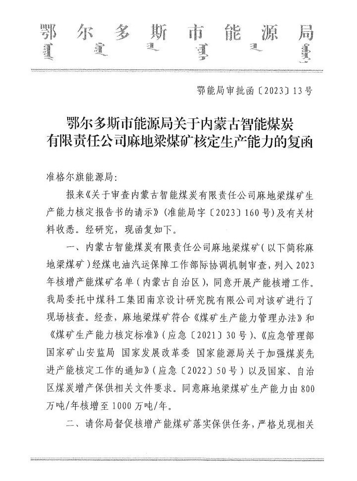6月13日,從內(nèi)蒙古準(zhǔn)格爾旗能源局獲悉,皖北煤電集團(tuán)智能煤炭公司麻地梁煤礦生產(chǎn)能力核定報(bào)告書獲得鄂爾多斯市能源局批復(fù),生產(chǎn)能力由800萬噸/年核增至1000萬噸/年。這是繼2021年麻地梁煤礦獲得300萬噸/年核增產(chǎn)能后,取得的又一項(xiàng)突破性進(jìn)展,標(biāo)志著皖北煤電集團(tuán)公司首個(gè)千萬噸級(jí)礦井誕生。