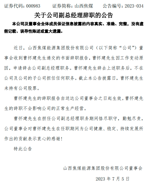 7月6日,山西焦煤集團(tuán)旗下A股上市公司山西焦煤發(fā)布《關(guān)于公司董事、總經(jīng)理辭職的公告》《關(guān)于公司副總經(jīng)理辭職的公告》。