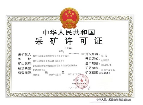 2、8月3日,內(nèi)蒙古自治區(qū)自然資源廳為鄂托克前旗恒源投資實業(yè)有限責(zé)任公司巴愣煤礦頒發(fā)采礦許可證,標志著該礦手續(xù)辦理取得重大突破,也為項目早日開工建設(shè)奠定堅實基礎(chǔ)。