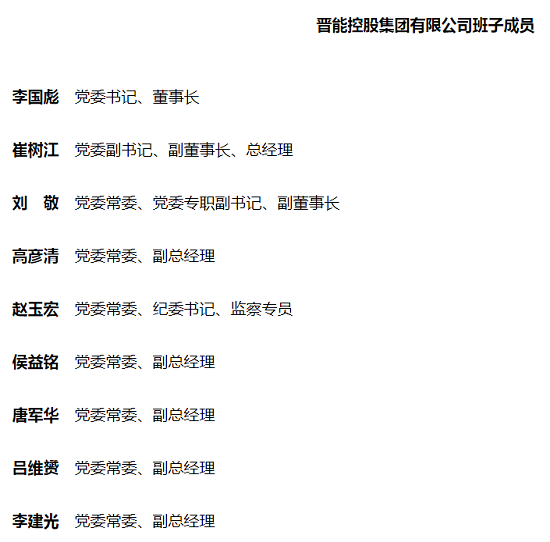 如上圖所示,此次調(diào)整后,晉能控股集團(tuán)領(lǐng)導(dǎo)班子成員將達(dá)到9位:分別為李國(guó)彪(黨委書記、董事長(zhǎng))、崔樹(shù)江(黨委副書記、副董事長(zhǎng)、總經(jīng)理)、劉敬(黨委常委、黨委專職副書記、副董事長(zhǎng))、高彥清(黨委常委、副總經(jīng)理)、趙玉宏(黨委常委、紀(jì)委書記、監(jiān)察專員)、侯益銘(黨委常委、副總經(jīng)理)、唐軍華(黨委常委、副總經(jīng)理)、呂維赟(黨委常委、副總經(jīng)理)、李建光(黨委常委、副總經(jīng)理)。