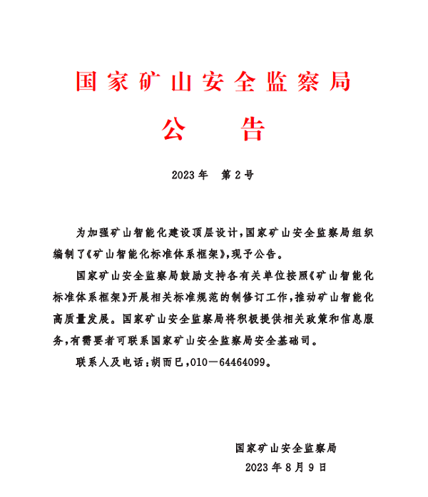 5、國家礦山安全監(jiān)察局鼓勵支持各有關(guān)單位按照《礦山智能化標(biāo)準(zhǔn)體系框架》開展相關(guān)標(biāo)準(zhǔn)規(guī)范的制修訂工作,推動礦山智能化高質(zhì)量發(fā)展。國家礦山安全監(jiān)察局將積極提供相關(guān)政策和信息服務(wù),有需要者可聯(lián)系國家礦山安全監(jiān)察局安全基礎(chǔ)司。