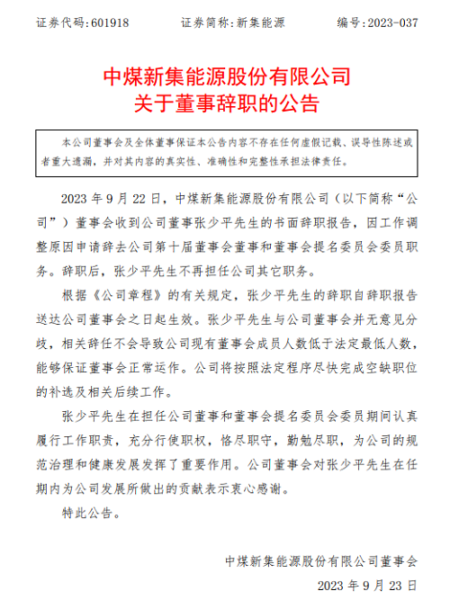 2、中煤新集能源(601918)股份有限公司(證券簡(jiǎn)稱(chēng):新集能源)發(fā)布公告稱(chēng),9月22日,公司董事會(huì)收到公司董事張少平先生的書(shū)面辭職報(bào)告,因工作調(diào)整原因申請(qǐng)辭去公司第十屆董事會(huì)董事和董事會(huì)提名委員會(huì)委員職務(wù)。辭職后,張少平先生不再擔(dān)任公司其它職務(wù)。