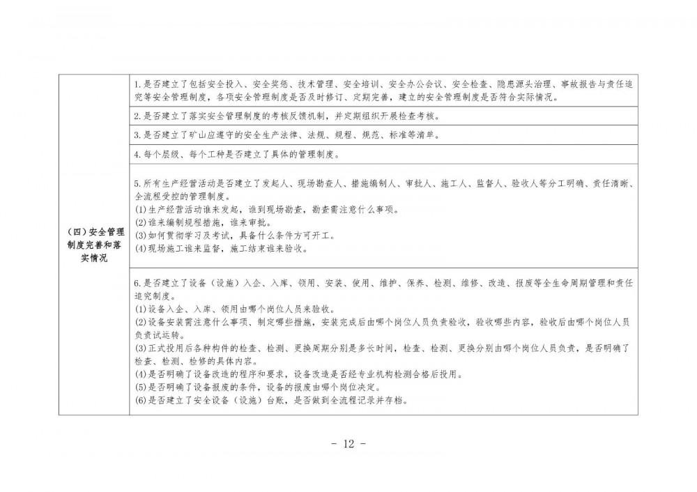 是否建立了包括安全投入、安全獎懲、技術(shù)管理、安全培訓(xùn)、安全辦公會議、安全檢查、隱患源頭治理、事故報告與責(zé)任追究等安全管理制度,各項安全管理制度是否及時修訂、定期完善,建立的安全管理制度是否符合實際情況;是否建立了落實安全管理制度的考核反饋機制,并定期組織開展檢查考核。每個層級、每個工種是否建立了具體的管理制度。所有生產(chǎn)經(jīng)營活動是否建立了發(fā)起人、現(xiàn)場勘查人、措施編制人、審批人、施工人、監(jiān)督人、驗收人等分工明確、責(zé)任清晰、全流程受控的管理制度。是否建立了設(shè)備(設(shè)施)入企、入庫、領(lǐng)用、安裝、使用、維護、保養(yǎng)、檢測、維修、改造、報廢等全生命周期管理和責(zé)任追究制度。