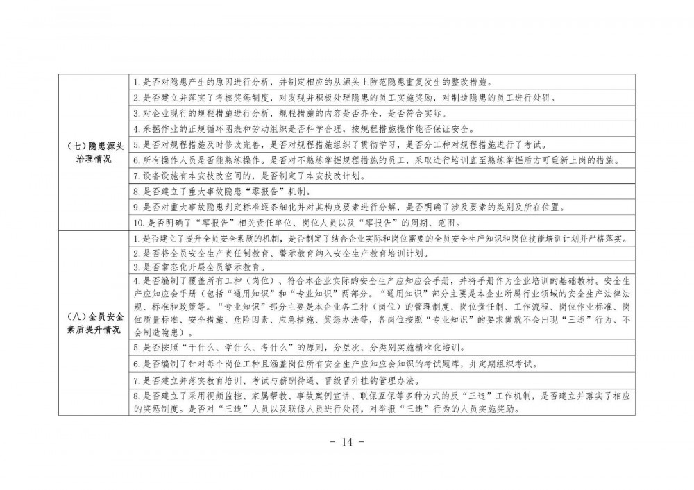 為深入貫徹落實習(xí)近平總書記關(guān)于安全生產(chǎn)重要論述和重要指示批示精神,按照《中華人民共和國安全生產(chǎn)法》《煤礦安全生產(chǎn)條例》《山西省進一步加強礦山安全生產(chǎn)工作措施》《山西省安全生產(chǎn)委員會辦公室關(guān)于印發(fā)〈關(guān)于貫徹落實《關(guān)于防范遏制礦山領(lǐng)域重特大生產(chǎn)安全事故的硬措施》的實施措施〉的通知》等規(guī)定要求,進一步提升安全監(jiān)管效能,推動礦山企業(yè)持續(xù)夯實安全管理基礎(chǔ),切實加強精細(xì)化管理,努力創(chuàng)建高品質(zhì)的企業(yè)安全文化,真正實現(xiàn)礦山企業(yè)本質(zhì)安全,為扎實推動高質(zhì)量發(fā)展、深化全方位轉(zhuǎn)型創(chuàng)造良好安全環(huán)境,現(xiàn)就有關(guān)事項通知如下: