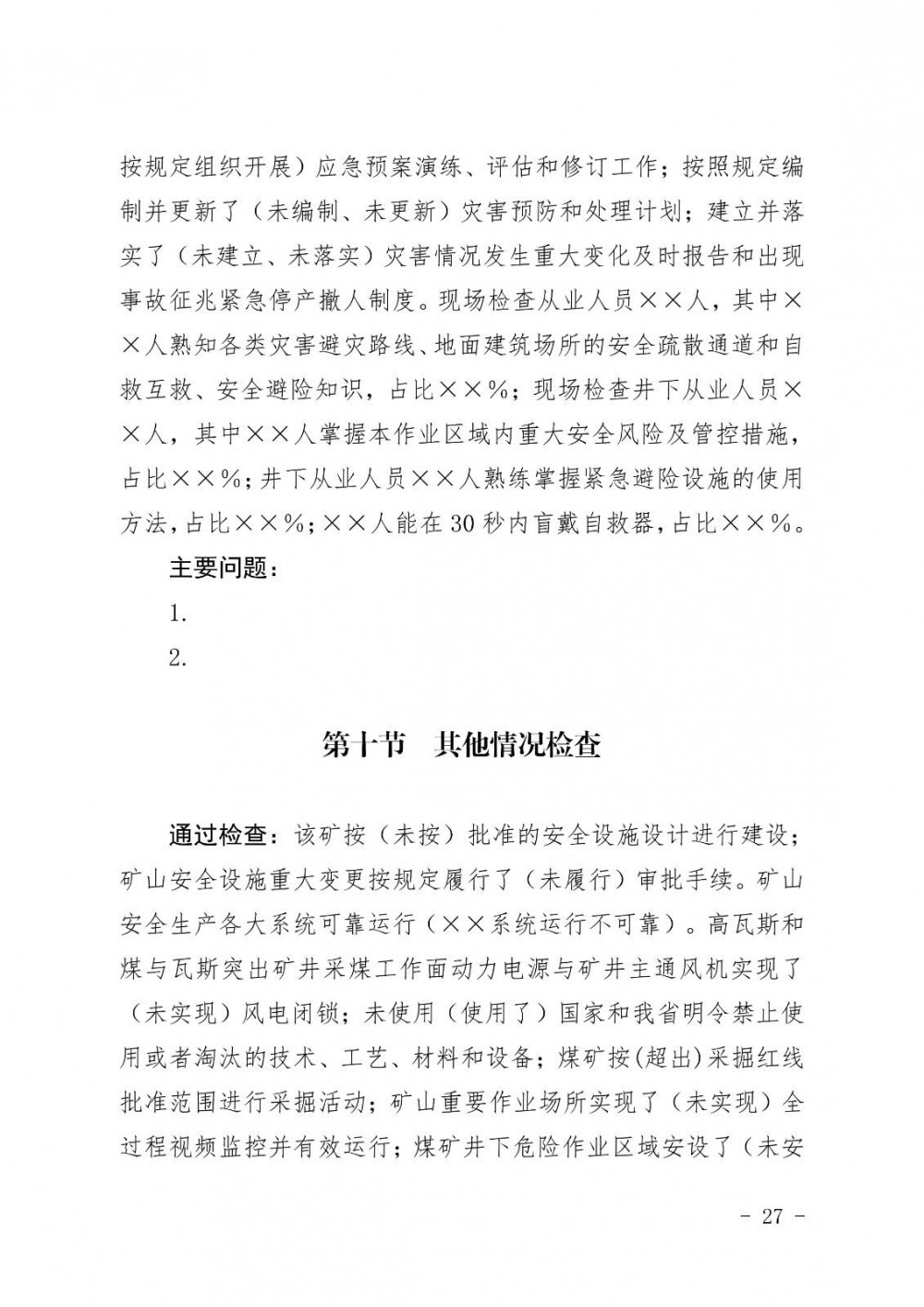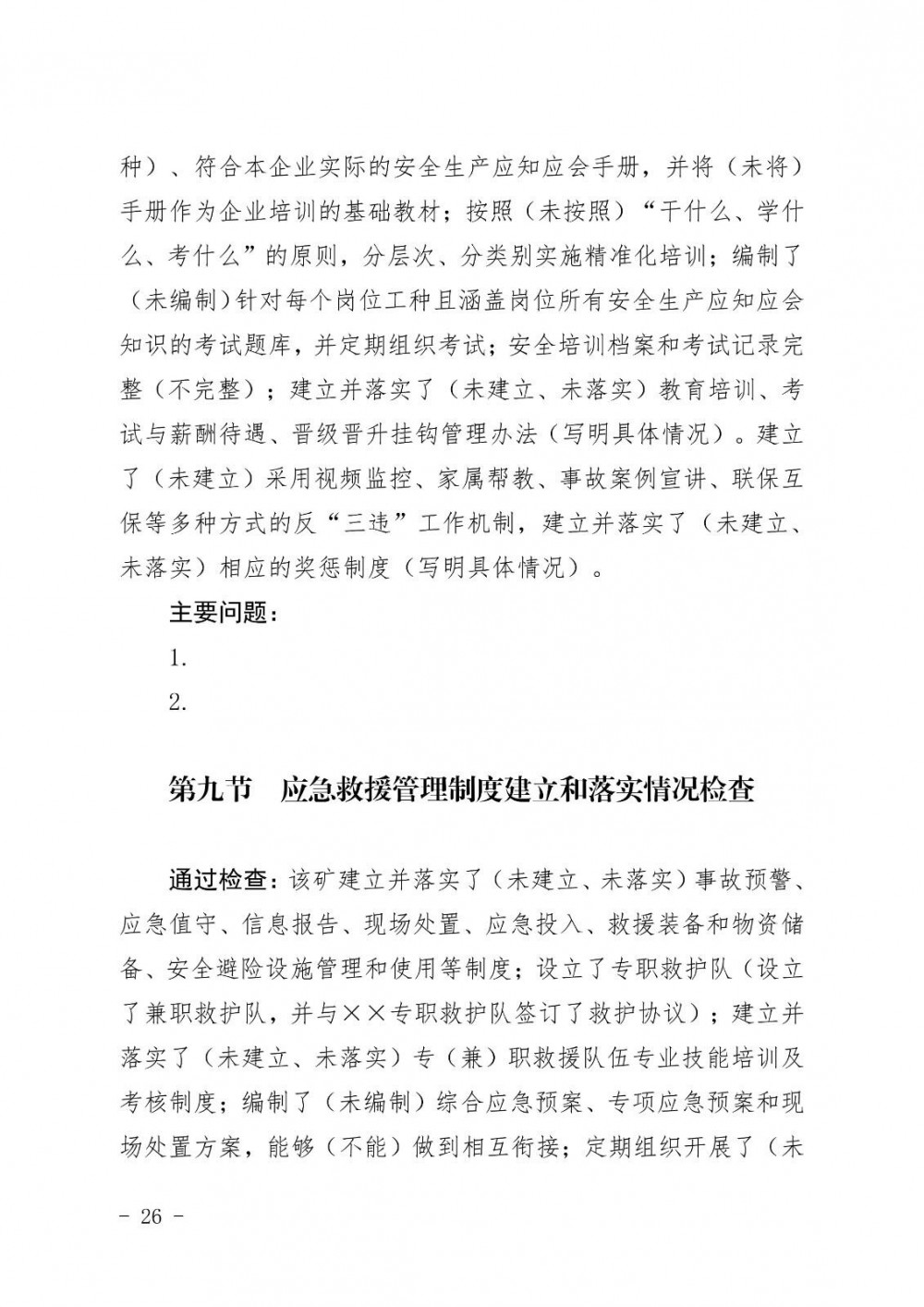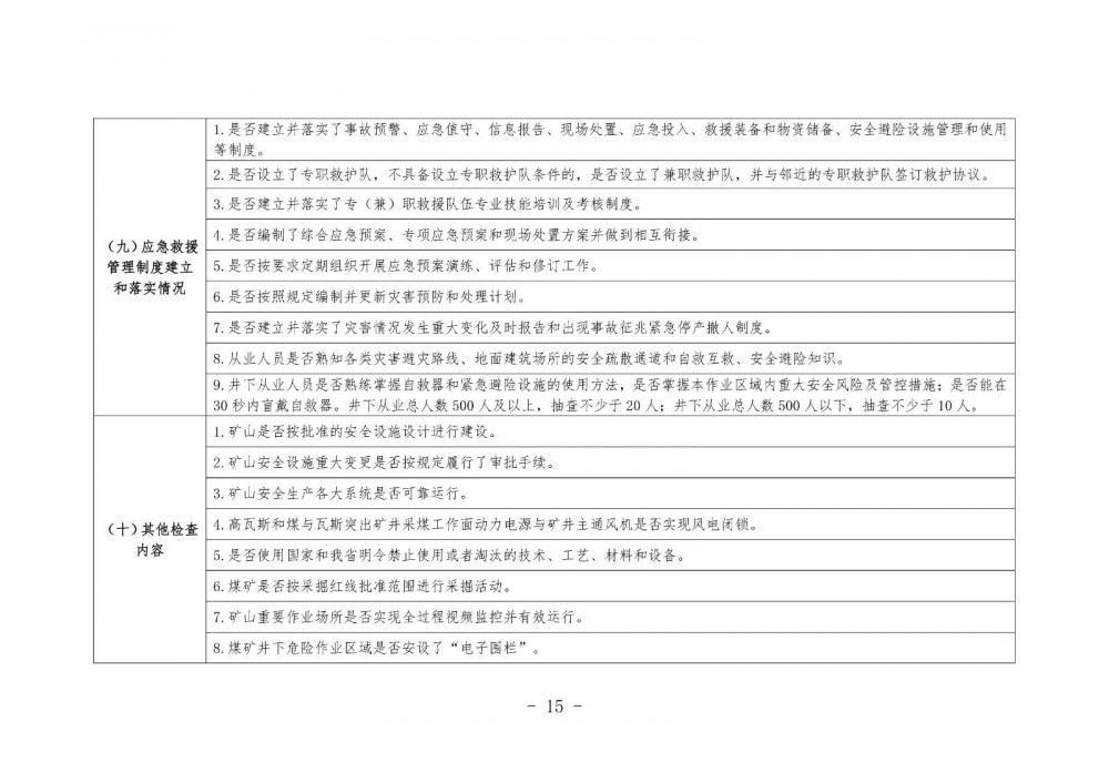 是否建立了事故預(yù)警、應(yīng)急值守、信息報告、現(xiàn)場處置、應(yīng)急投入、救援裝備和物資儲備、安全避險設(shè)施管理和使用等制度;是否設(shè)立了專職救護隊,不具備設(shè)立專職救護隊條件的,是否設(shè)立了兼職救護隊,并與鄰近的專職救護隊簽訂救護協(xié)議,是否建立了專(兼)職救援隊伍專業(yè)技能培訓(xùn)及考核制度;是否編制了綜合應(yīng)急預(yù)案、專項應(yīng)急預(yù)案和現(xiàn)場處置方案并做到相互銜接;是否按要求定期組織開展應(yīng)急預(yù)案演練、評估和修訂工作;是否按照規(guī)定編制并更新災(zāi)害預(yù)防和處理計劃;是否建立了災(zāi)害情況發(fā)生重大變化及時報告和出現(xiàn)事故征兆緊急停產(chǎn)撤人制度;從業(yè)人員是否熟知各類災(zāi)害避災(zāi)路線、地面建筑場所的安全疏散通道和自救互救、安全避險知識;井下從業(yè)人員是否熟練掌握自救器和緊急避險設(shè)施的使用方法,是否掌握本作業(yè)區(qū)域內(nèi)重大安全風(fēng)險及管控措施,是否能在 30 秒內(nèi)盲戴自救器。