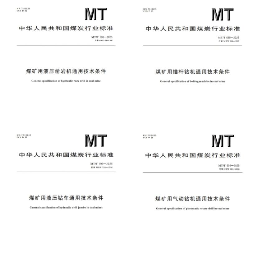 近日,由中國(guó)煤科煤科院主導(dǎo)修訂的MT/T 199-2025《煤礦用液壓鉆車通用技術(shù)條件》、MT/T 198-2025《煤礦用液壓鑿巖機(jī)通用技術(shù)條件》、MT/T 688-2025《煤礦用錨桿鉆機(jī)通用技術(shù)條件》、MT/T 994-2025《煤礦用氣動(dòng)鉆機(jī)通用技術(shù)條件》4項(xiàng)煤炭行業(yè)標(biāo)準(zhǔn)經(jīng)國(guó)家能源局發(fā)布,正式實(shí)施。