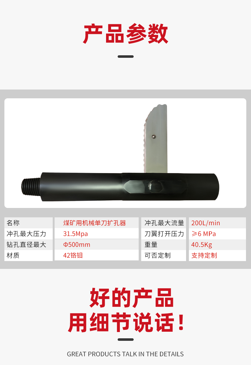 煤礦用機(jī)械單刀擴(kuò)孔器是一種高效的采煤設(shè)備,采用的單刀結(jié)構(gòu)設(shè)計(jì)可以快速地進(jìn)行煤巖體的切割和開(kāi)采,材質(zhì)選用了42鉻鉬材質(zhì)使其更加耐磨耐用,同時(shí),在操作過(guò)程中,該設(shè)備噪音小、易操作、維修方便,極大地提高了采煤作業(yè)的效率和安全性。主要針對(duì)底抽巷穿層鉆孔、本煤層順層鉆孔擴(kuò)孔增透作業(yè),在鉆孔進(jìn)行操作時(shí),靜壓水常規(guī)鉆進(jìn),當(dāng)鉆頭到達(dá)煤層孔內(nèi)需擴(kuò)孔深度時(shí),通過(guò)高壓水泵輸入高壓水,壓力達(dá)到8MPA時(shí)推動(dòng)機(jī)械水刀的活塞,使刀翼打開(kāi)旋轉(zhuǎn)排渣、緩慢鉆進(jìn),進(jìn)行擴(kuò)孔造穴工作 ,總體來(lái)說(shuō),煤礦用機(jī)械雙刀擴(kuò)孔器是一種創(chuàng)新型的采煤設(shè)備,具有高效、智能、穩(wěn)定的特點(diǎn),使得煤礦采煤作業(yè)更加科學(xué)化、安全化、高效化,為中國(guó)煤炭行業(yè)的發(fā)展做出了杰出的貢獻(xiàn)。