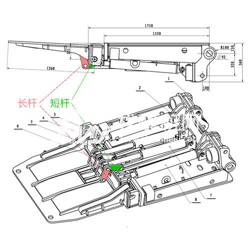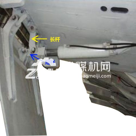 液壓支架中長(zhǎng)桿、短桿與護(hù)幫板和護(hù)幫千斤頂組成小四連桿機(jī)構(gòu),從而實(shí)現(xiàn)護(hù)幫板與前梁(頂梁)的鉸接。