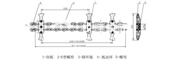 用U型螺栓將刮板固定在鏈條上(組成刮板鏈),刮板鏈繞過鏈輪作無級閉合循環(huán)運行,完成煤炭的輸送。