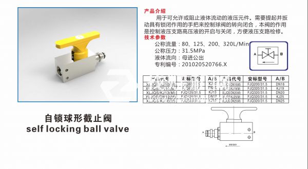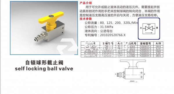 用于可允許或阻止液體流動的液壓元件。需要提起并扳動具有鎖閉作用的手把來控制球閥的轉向閉合,本閥的作用是控制液壓支路高壓液的開啟與關閉,方便液壓支路檢修。