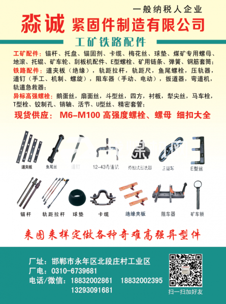| 主營商品 | 錨桿 .球墊,道夾板,卡纜 ,托輥,軌距拉桿,礦車銷,鋼筋網(wǎng)片,刮板,地鐵螺栓,螺栓 ,螺母,煤礦錨固擠,緊固件,工礦鐵路配件 一站式采購 | ||